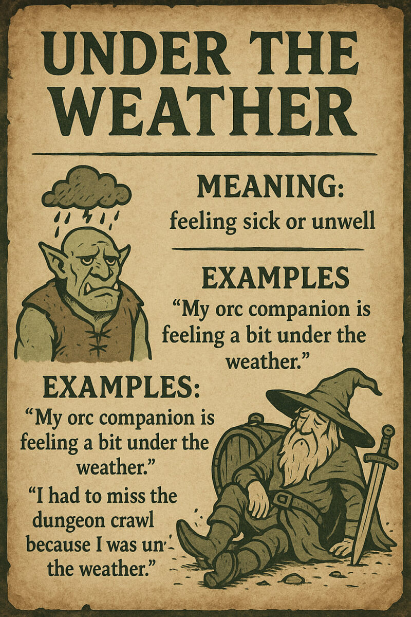 📜 “Under the Weather” 📅 Дата отправки: 1.08.2025 🎯 Цель: Понять и начать использовать идиому “under the weather” как истинный носитель языка (или опытный бард, переживший грипп дракона) 🌧 ФРАЗА: Under the weather 🗣 Значение: Чувствовать себя плохо, быть нездоровым или слегка заболевшим — не в лучшей форме 🧪 ПРОИСХОЖДЕНИЕ (Фрагмент Древнего Знания): Фраза, скорее всего, пришла из морского жаргона. Моряков, страдавших от морской болезни, отправляли "under the weather bow" — на подветренную сторону корабля в шторм. Со временем выражение прижилось на суше. 🧙♂️ ПРИМЕРЫ ИЗ ПОВСЕДНЕВНОГО ЛЕКСИКОНА: “I won’t make it to spell-casting class today — I’m feeling a bit under the weather.” - “Сегодня я не дойду до класса по заклинаниям — чувствую себя немного under the weather.” “After eating that mystery stew from the goblin market, Arlo was definitely under the weather.” - “После таинственного рагу с гоблинского рынка Арло явно был under the weather.” “You look pale, brave adventurer. Und