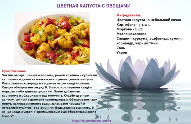 🥦 ЦВЕТНАЯ КАПУСТА С ОВОЩАМИ 🌀 Ингредиенты: Цветная капуста - 1 небольшой кочан Картофель - 3-4 шт. Морковь - 2 шт. Масло кокосовое Специи – куркума, асафетида, кумин, кориандр, черный тмин Соль Укроп 🌀 Приготовление: Чистим овощи. Шинкуем морковь, режем крупными кубиками картофель и делим на маленькие соцветия цветную капусту. Разогреваем сковороду и в горячее масло кладём специи. Специи обжариваем секунд 8. В масло со специями кладём морковь и обжариваем 3-5 минут. Затем добавляем картофель и обжариваем ещё минуты 3. Кладём цветную капусту, солим и тщательно перемешиваем. Обжариваем пару минут, наливаем немного воды, закрываем крышкой и оставляем тушится на 10-13 минут. Вода должна выкипеть. В конце кладём укроп. Перемешиваем и ещё обжариваем около 2 минут.