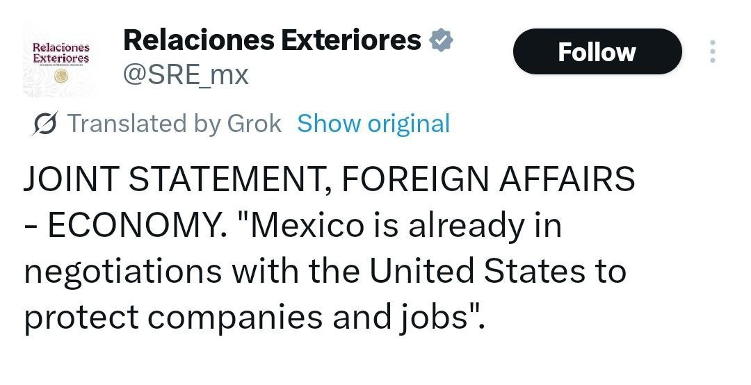 В ответ на пост Mexico’s response: Trump’s tariff letter 'UNFAIR treatment' But says it’s already in talks with Trump’s team to solve issue before tariffs kick in