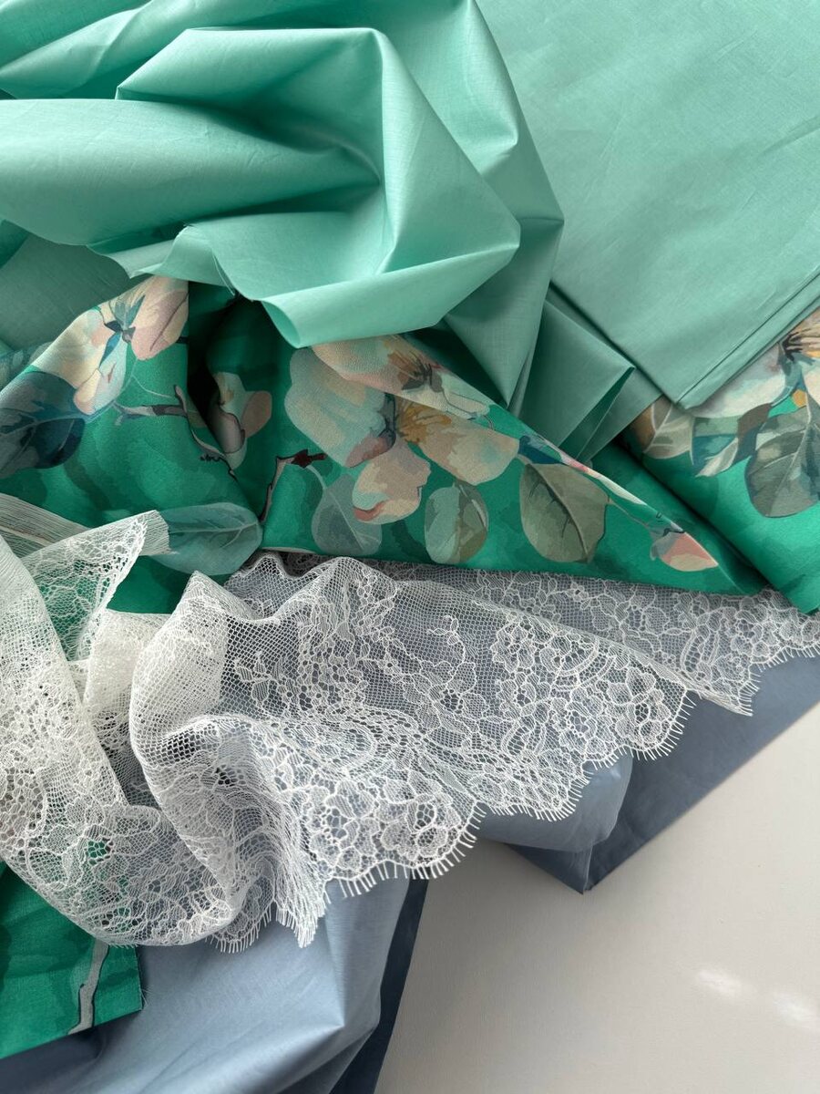 Наш новый хлопок с цветами на зеленом фоне идеально подходит и к мятному, и серо-голубому хлопкам. Прекрасно будет смотреться в комбинации из рубашки и шорт или юбки.