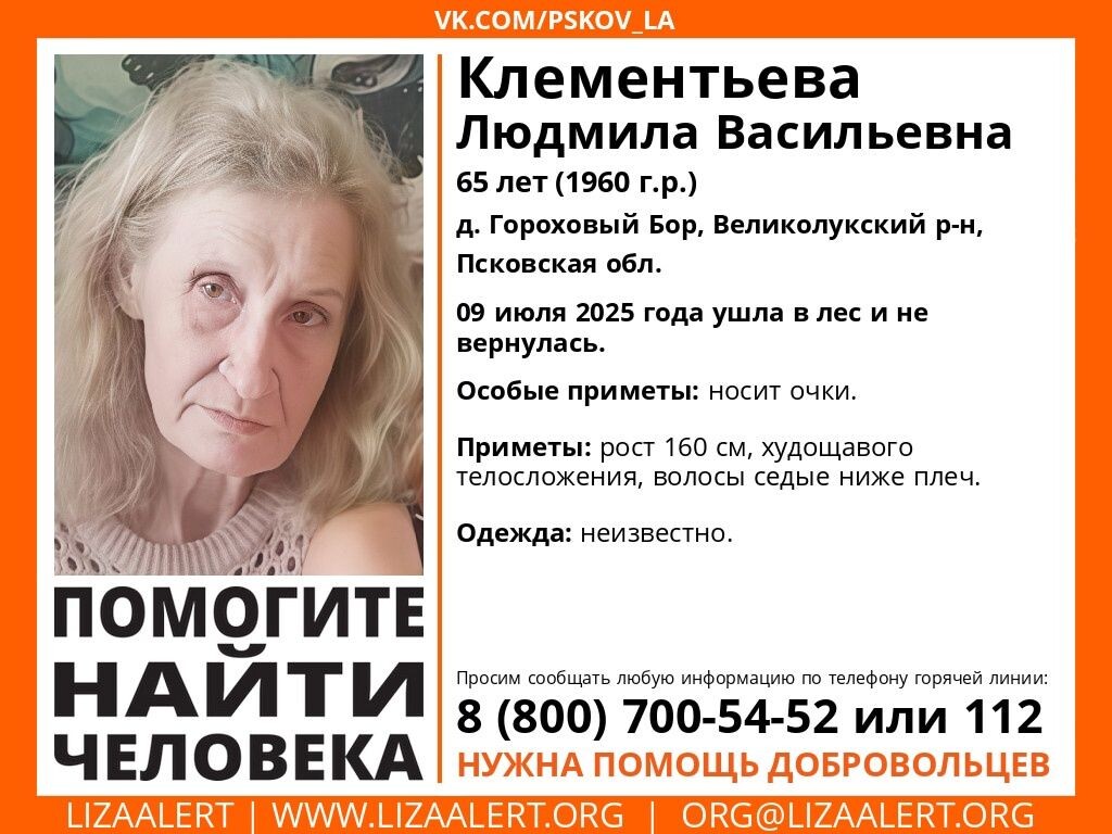 Помогите найти человека 🔍 Пропала Людмила Васильевна Клементьева, 65 лет. 9 июля 2025 года она ушла в лес в деревне Гороховый Бор (Великолукский район) и не вернулась. 📞 Контакты для информации: Кера (Татьяна) — `+7 (911) 397-43-00`. Поиски ведёт отряд "ЛизаАлерт" Псковской области. 👉Подписывайтесь на ВЛуки.ру