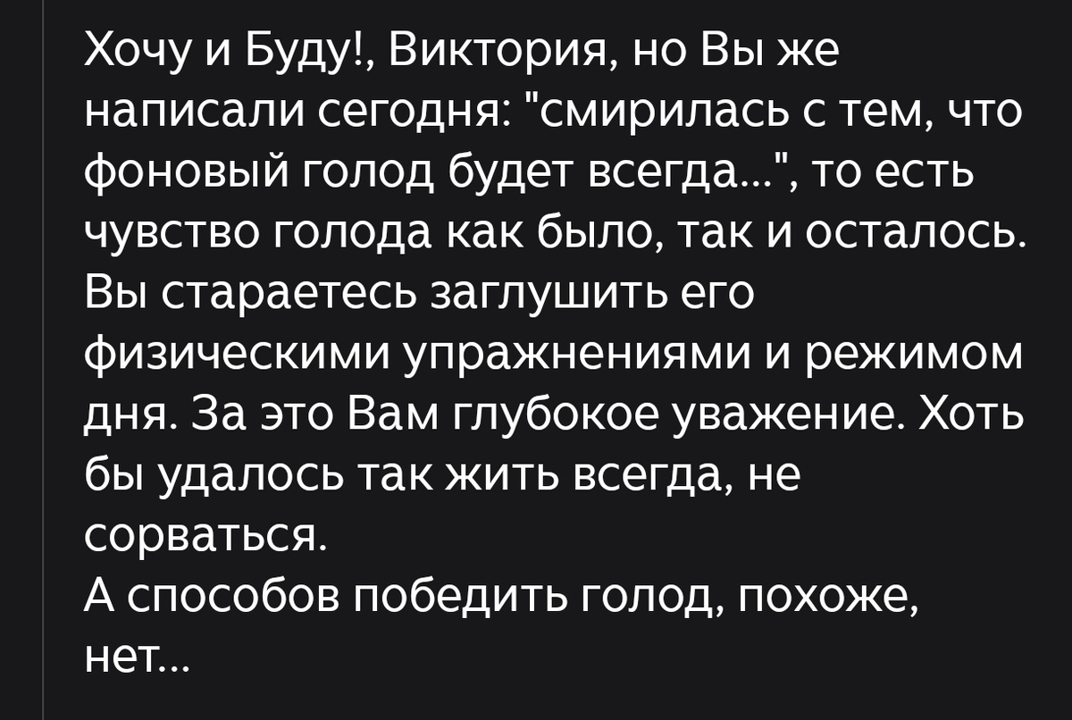 Также как с болью в спине, где-то через пару лет от начала своего похудения я поняла, что фоновый голод ушел, я могу забыть поесть, для меня еда потеряла такую ценность, как раньше.