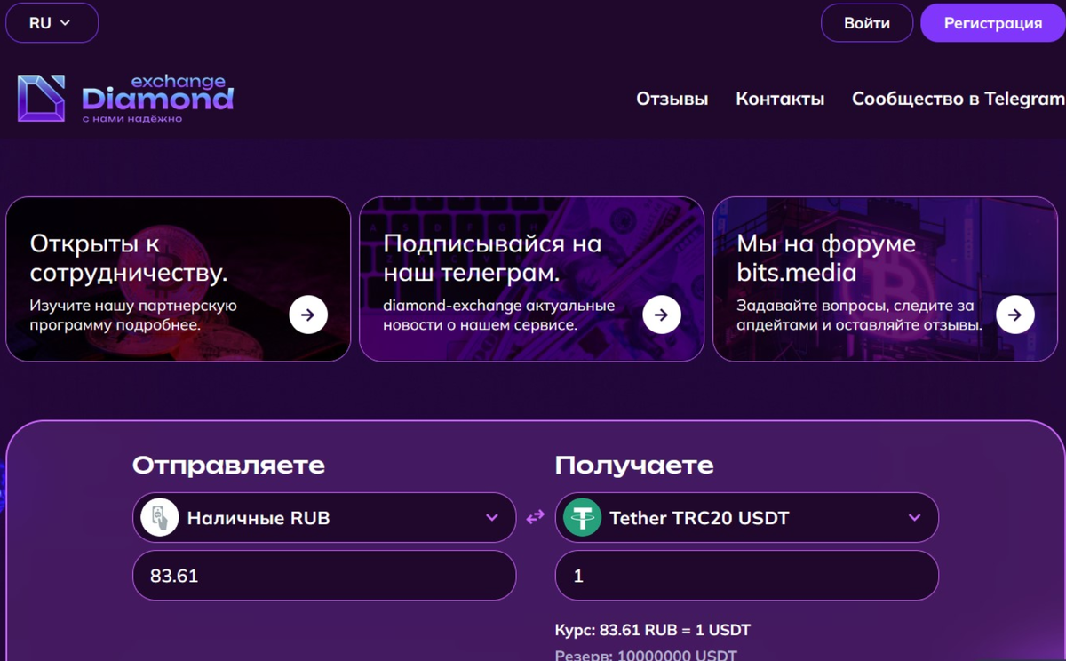 Diamond Exchange – электронный обменный сервис. Владельцы площадки сообщают пользователям о том, что здесь они смогут быстро и выгодно обменять валюту, будучи уверенными в безопасности проводимых операций. На первый взгляд обменник кажется вполне достойным внимания, поэтому заинтересует многих пользователей. Но как дела обстоят в реальности? Действительно ли на данной площадке можно выполнить выгодную и безопасную конвертацию валют? Мы проверили проект, прочли отзывы о нем. Предлагаем рассмотреть результаты анализа. ✅ Проект, который прошел проверку: здесь рабочий способ заработка ◀️ Владельцы Diamond Exchange презентовали его как надежный обменник, предлагающий выгодные условия конвертации валют. А чтобы больше расположить пользователей к проекту, на его сайте разместили отзывы, якобы, от реальных клиентов. Основная масса этих публикаций носит положительный характер. Но стоит ли им верить? Мы не советуем это делать. Изучив сайт, можно заметить признаки его мошеннической природы. И п