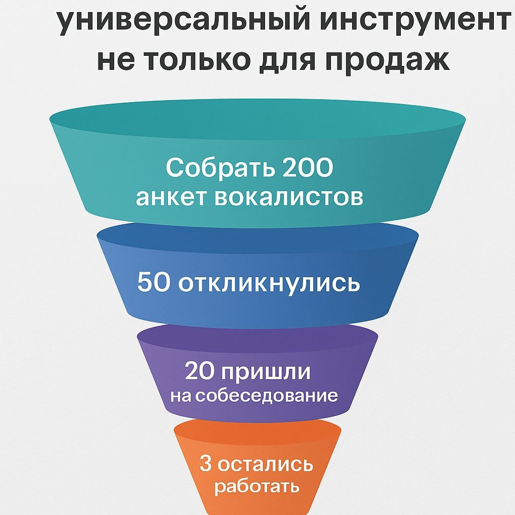 Дневник ИПэшницы. День 113/365 Воронка — универсальный инструмент не только для продаж Я тут недавно поняла: воронку можно использовать вообще везде. В бизнесе, в найме, даже… в знакомствах 😅 📌 Как работает воронка: На старте ты собираешь много контактов → потом отсеиваешь тех, кому реально интересно → дальше ещё отбраковка по вовлечённости → и на выходе остаются самые ценные. Пример на пальцах: 🔸 Собрала 200 анкет вокалистов 🔸 50 откликнулись 🔸 20 пришли на собеседование 🔸 8 дошли до стажировки 🔸 3 остались работать И то же самое с клиентами, учениками, франчайзи, даже потенциальными друзьями 🤝 👉 Гуманно ли это? А почему нет? Ты никого не заставляешь. Просто создаёшь возможности для тех, кто реально готов. Остальные — мимо кассы. И это честно. Я за то, чтобы строить воронки во всех сферах жизни. Это экономит время и нервы. А ты уже применяла воронку за пределами продаж? 👇 #дневникИПэшницы #воронкапродаж #воронканайма #бизнеслайфхаки #бизнесбезсоплей