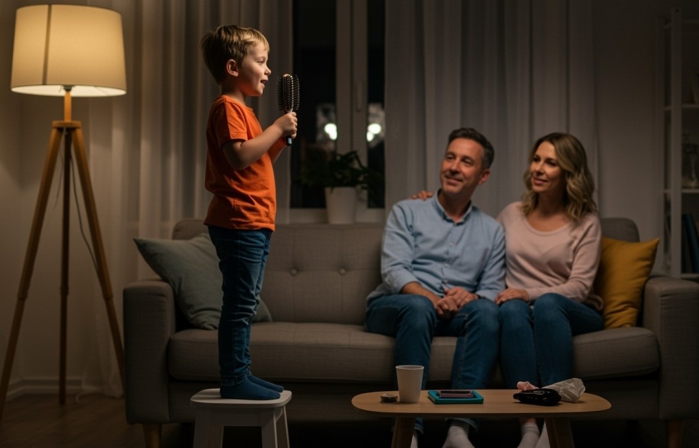 Восьмилетний Артем стоит на табуретке посреди гостиной, держа в руках мамину расческу вместо микрофона. Свет настольной лампы падает на его лицо, как софиты на сцене. Родители сидят на диване, обнявшись после очередной ссоры из-за домашних дел.