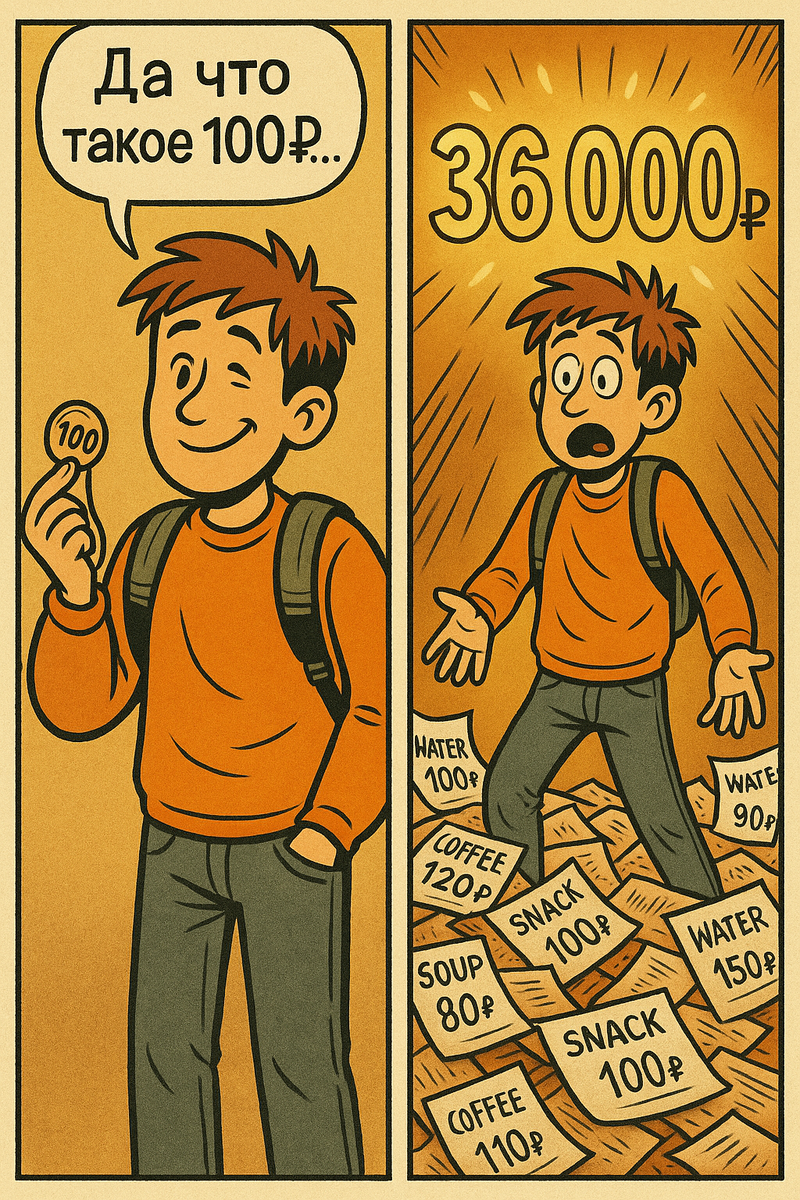…и почему мы не обязаны от всего отказываться Представьте: вы не покупаете люксовые сумки, не играете на бирже, не арендуете бизнес-джеты. Вы просто живёте. И где-то по дороге к делам — покупаете кофе. Или бутылку воды. Или круассан. Ну что там — мелочь. 100 рублей. А потом наступает декабрь, вы листаете банковские выписки и вдруг замечаете, что ваш банк — это вы. Только для кофе, снэков и внезапных перекусов. Посчитаем.