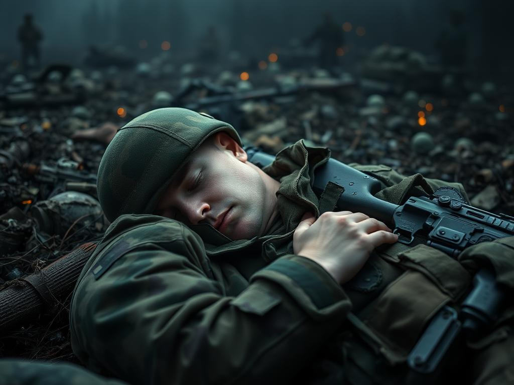 Промпт для картинки: Солдат в военной форме мирно спит в полевых условиях, вокруг шум и хаос боя, но он абсолютно спокоен, драматическое освещение, контраст покоя и напряжения Бессонница съедала мою жизнь. Лежал часами, прокручивал в голове проблемы, а утром был как зомби. Пока не узнал про технику, которую используют в американской армии. Проблема современного человека: