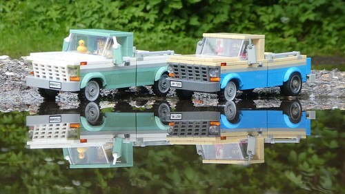 Автор @Brick_Lover_77 создал потрясающий дуэт классических пикапов. Детализация на высоте — от решётки радиатора до реалистичных колёс. А этот отражение в воде? Идеальный штрих!