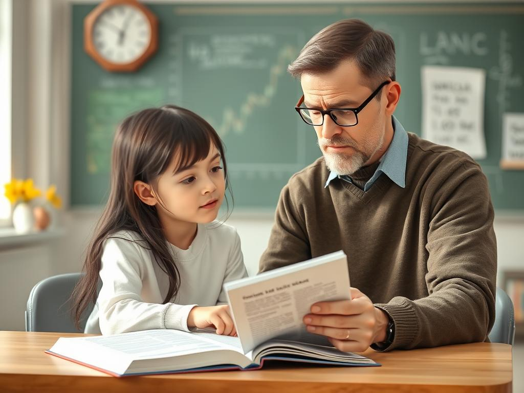 Промпт для картинки: Учитель объясняет сложную тему простыми словами ребенку, классная доска с простыми рисунками и схемами, момент понимания в глазах ученика, теплая образовательная атмосфера