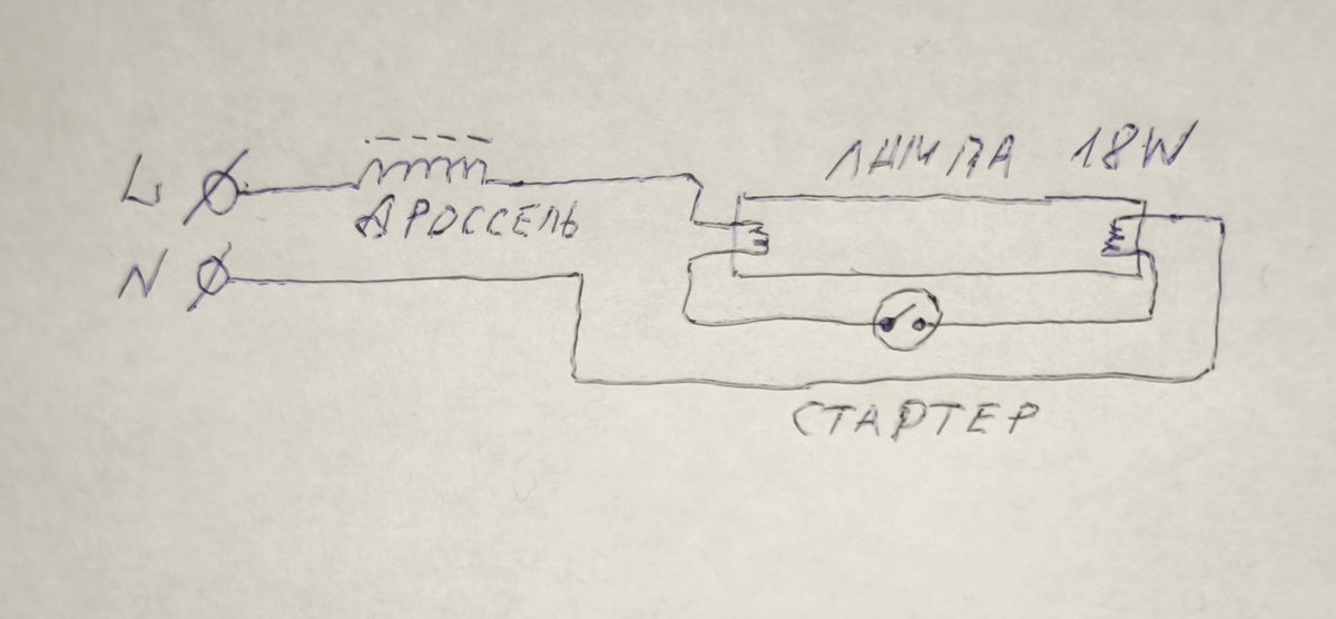 Привет, народ! В интернетах гуляет много видео на тему того, можно ли зажечь люмку через лампу накаливания вместо дросселя. Авторы видео сходятся на том, что нет, нельзя. Как выяснилось, есть нюанс. Рассмотрим классическую схему подключения люминисцентной лампы: Здесь дроссель подключается последовательно лампе и служит двум целям: первая - это ограничение тока через лампу (реактивное сопротивление), а вторая - кратковременный всплеск напряжения на лампе порядка 400В при размыкании контактов стартера за счёт явления самоиндукции. Всплеск напряжения служит для начального пробоя газа и запуска лампы. После запуска напряжения на лампе падает до 60-80В. Что будет если мы заменим дроссель активной нагрузкой в виде лампы накаливания? Лампа накаливания также сможет поддерживать рабочий ток через люмку, т.к. лампа накаливания - это активное сопротивление. А вот реактивный выброс напряжения в момент старта лампы уже создать не сможет. Для эксперимента возмём современную лампу Philips 18Вт и под