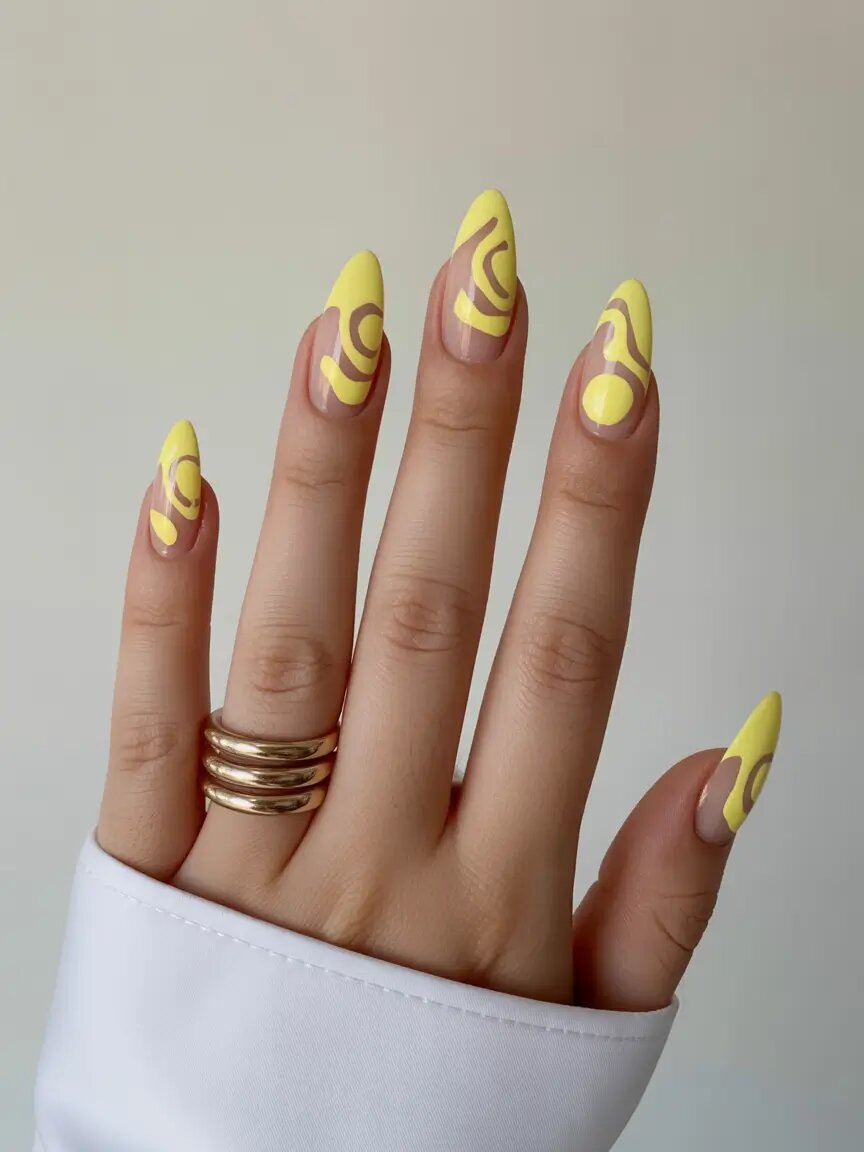 Есть что-то завораживающее в абстрактных изгибах с жёлтым акцентом, которые можно увидеть в летних идеях для маникюра. Эти миндалевидные ногти сочетают в себе голую ногтевую пластину и маслянисто-жёлтый лак с яркими, хаотичными футуристическими завитками. Дизайн не отличается симметрией, что придаёт руке приятный неожиданный ритм. Это эффектный способ носить жёлтый цвет с уверенностью.