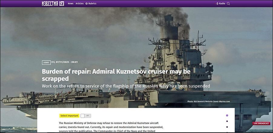 "Минобороны России может отказаться от восстановления авианосца «Адмирал Кузнецов», выяснили «Известия». В настоящее время его ремонт и модернизация приостановлены , сообщили источники издания