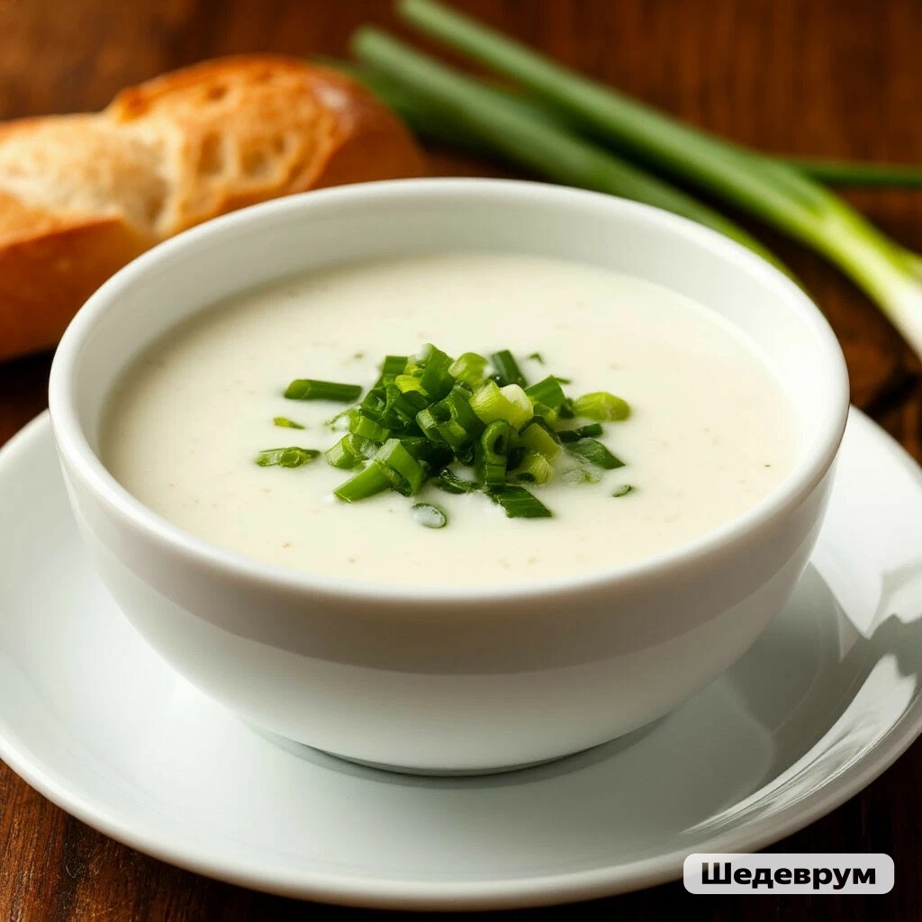 Холодный крем-суп Вкусный суп с нежной кремовой текстурой, который подают холодным. Его можно легко приготовить из лука-порея, картофеля и сливок. Ходят споры, кто и когда изобрел этот суп. По одной из версий, он был изобретен французским поваром Луи Диа в 1917 году. За основу он взял рецепт супа, который ему готовили в детстве дома. Для приготовления этого супа необходимо всего несколько простых ингредиентов. Традиционно этот суп едят холодным, но его можно есть и горячим. Перед подачей в горячем виде, необходимо слить немного воды, а затем превращать его в пюре, иначе суп будет слишком жидким.