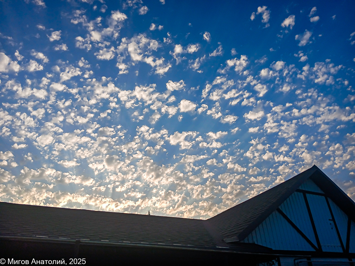 Странное небо было вчера перед закатом. Как будто горох рассыпали. Не знаю, к чему такое явление природы, но погода никак на него не отреагировала. Как была жара за тридцать, так и держится. В саду у нас по-прежнему тенисто и зелено. Лена каждый день начинает с полива. Первым делом грядки, а затем кусты и деревья. Встаёт рано и до завтрака старается пройти со шлангом практически по всему участку. Наша корги Тильда не любит эту процедуру и старается держаться подальше от водной струи. Однако и далеко уйти ей долг не позволяет, обязана держать хозяйку в поле зрения. Потому неотрывно сопровождает объект своего обожания, но позицию выбирает так, чтобы случайно не попасть под струю воды. На заднем дворе, на краю мангальной площадки, распустились ромашки. У нас тут уже несколько лет целая поляна этих цветов. Смотрятся как отражение неба в горошек. Или наоборот, наши ромашки так отражаются на синеве вечернего небосвода. Кошка Маруся внимательно наблюдала за мною, пока я топтался с камерой во