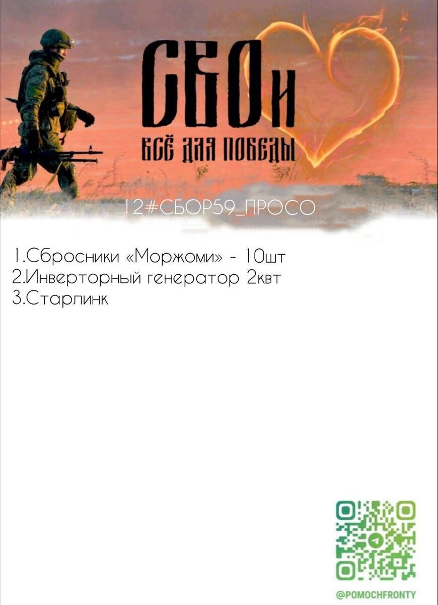 ⚡️😶😶😶😶 для 255 полка: поддержим наших штурмовиков - парней Просо! Открываем новый сбор для бойцов 255 полка — штурмовиков и операторов БПЛА штуромов из подразделения «Просо». Эти ребята работают на самом сложном направлении и выполняют критически важные задачи. Штурмовики идут первыми. Именно благодаря их сложной и опасной работе, благодаря слаженным действиям штурмовых групп мы имеем те большие успехи, которыми гордится вся страна. Штурмы — это наше всё, а БПЛА в составе штурмовых отрядов делают колоссальную работу, обеспечивая разведку и огневую поддержку наступающим подразделениям. 1. Starlink 5в — 33 305₽ https://ozon.ru/t/NAP2FBI 2. Сбросники «Моржоми»10шт × 2 700₽ = 27 000₽ 3. Генератор— 19 654₽ https://ozon.ru/t/1W4Z0MA Сергей Викторович Сумма сбора: 79 959 ₽ Реквизиты для поддержки: 💳 Т-Банк: 2200701225452439 📱 СБП: 89936125765 Юлия Ф./Иван П. ⚠️ Вы можете самостоятельно заказать любую позицию на пункт выдачи Горки-2, д. 11. В случае самостоятельного заказа напиш