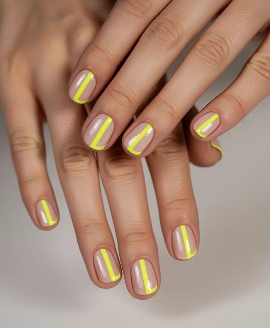 Этот образ — воплощение принципа «*минимальные усилия, максимальная отдача*». Основа нюдовая, почти прозрачная, но толстая ярко-жёлтая линия проходит по каждому ногтю, словно графический восклицательный знак. Он лаконичный, строгий и отлично сочетается как с пляжной одеждой, так и с блейзерами.