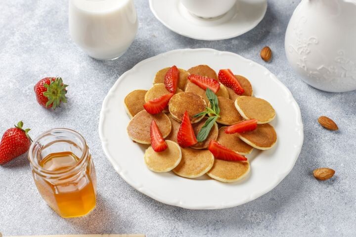 Сейчас ягоды в изобилии, но, кажется, ваш ребёнок быстро теряет к ним интерес. Всё-таки кислинку клубники, смородины, малины хочется нейтрализовать чем-то сытным. Предлагаем подать в чашке для салата мини-панкейки с ягодами. Такое блюдо ещё называют блинной кашей, его можно есть при помощи вилки. Сверху мини-панкейки можно полить мёдом или растопленным шоколадом. Ингредиенты потребуются те же, что и для оладушек. Но есть несколько нюансов в приготовлении, что делает это блюдо особенным.