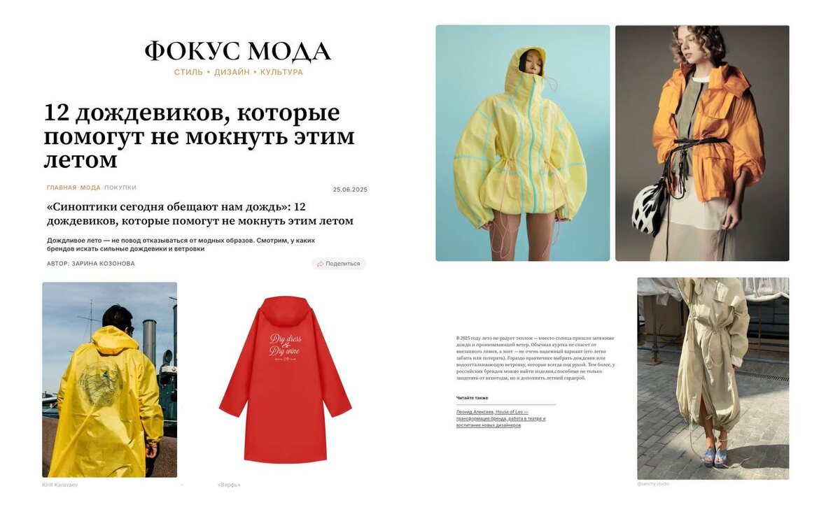 Несмотря на яркое солнце и жаркую погоду сейчас, не стоит забывать: уже на следующей неделе синоптики обещают дожди. Самое время подготовиться — и сделать это стильно. Мы уверены: даже в самый промозглый день можно выглядеть стильно. В новом материале рассказываем, где искать красивые и функциональные дождевики и ветровки, которые спасут от ливня и станут частью образа. От ироничных моделей с надписями Kirill Karavaev до трансформеров Novaya, от пастельных ветровок до лаконичных анораков — с нашими брендами защита от дождя становится частью образа. Читать #ФокусМода_статья