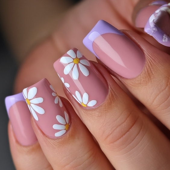 С началом учебного года я обычно выбираю дизайн ногтей с цветочными мотивами. Они наполнены надеждой и радостью и идеально соответствуют трендам 2025 года. Кроме того, сиреневые кончики придают образу стильный вид, но не перегружают его.