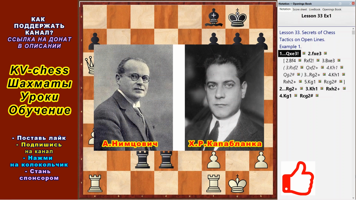 В этом уроке мы разберем комбинации, в которых тяжёлые фигуры, ферзь и ладьи, действуют по второй и седьмой горизонтали, а также по вертикалям g и h. Плейлист со всеми уроками для начинающих: https://dzen.ru/suite/1c93efae-1579-45ca-8c68-4b9c4da291d2 Видео по этому Уроку 33 - внизу. Если ладьи ворвались на вторую или седьмую горизонталь, у соперника почти всегда возникают проблемы с защитой, тем более если король оказывается прижатым к краю доски. Рассмотрим пример, который взят из партии Немцович-Капабланка, сыгранной в Нью-Йорке в 1927 году. Черные, которыми играл третий чемпион мира Капабланка, заняли ладьями вторую горизонталь и провели следующую комбинацию: 1...Фxe3 2.fxe3 Лg2+ 3.Крh1 Лxh2+ 4.Крg1 Лcg2# Одна ладья на предпоследней горизонтали также может создавать множество комбинационных возможностей. На экране пример из партии Михаила Чигорина, сыгранной в Нью-Йорке в 1889 году. Черные сыграли 1. ... С:h3!. Жертвой слона они разрушают пешечное прикрытие белого короля! 1...Сx