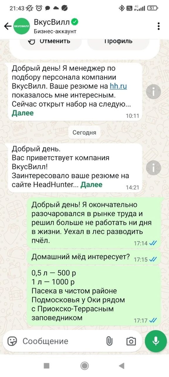 Скрин дня. Вместо работы во Вкусвилле парень открыл свой небольшой бизнес по производству мёда.