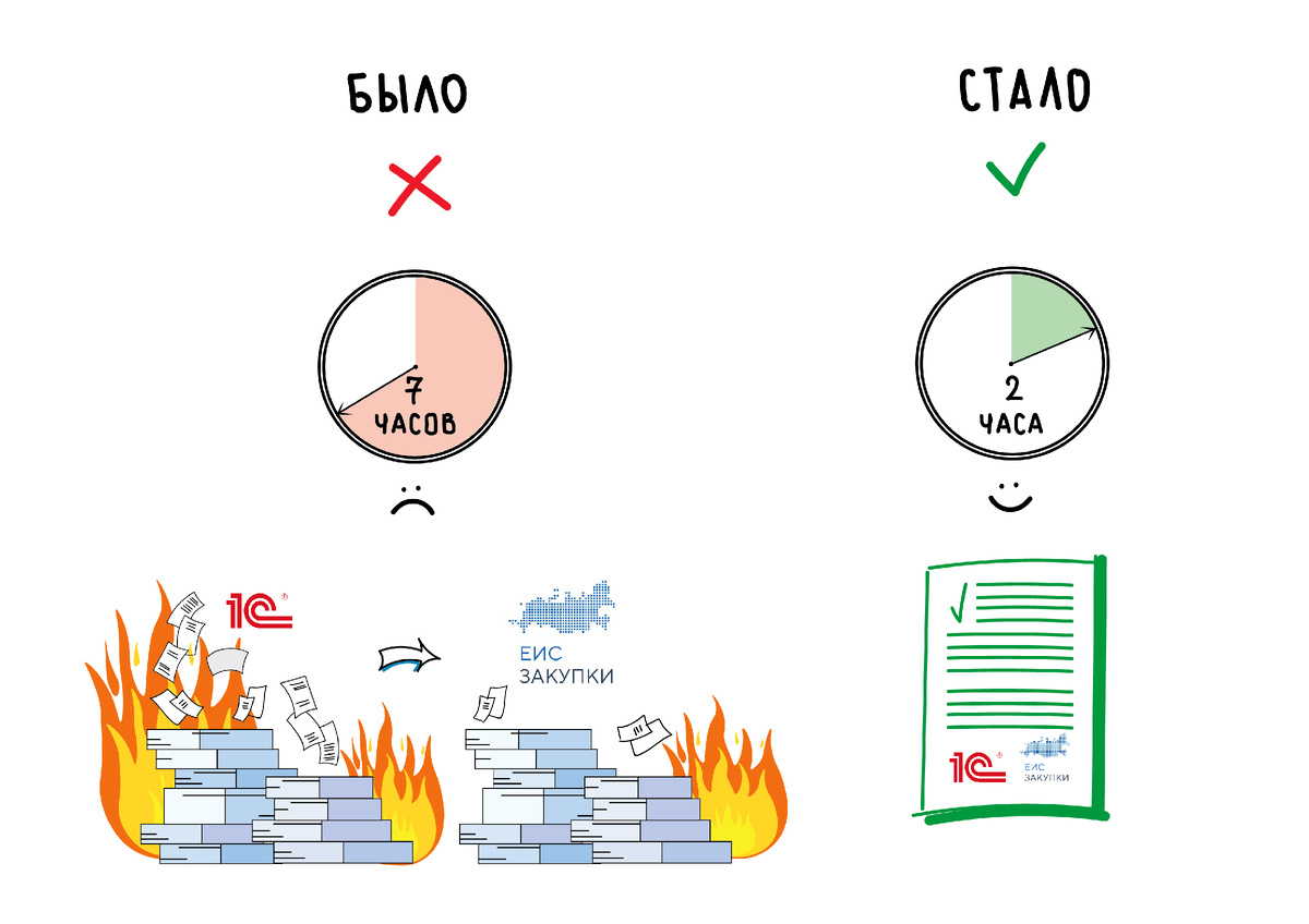 До интеграции оформление документов занимало 7 часов ежедневно (100–150 накладных в день). Документы сначала вводились в 1С, затем вручную переносились на сайт ЕИС.