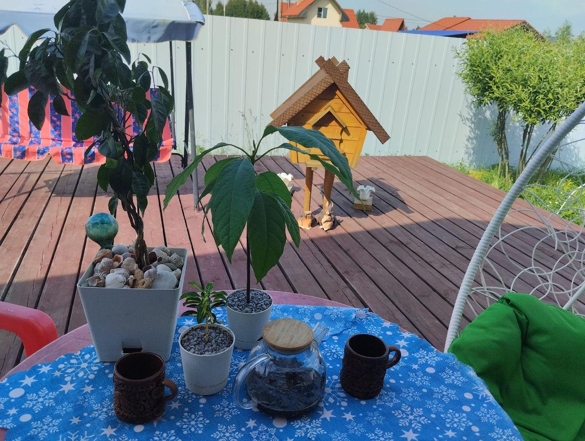Привет, друзья! У меня отпуск начался, ура! Отдыхаю в деревне, качаюсь в "люле", занимаюсь потихоньку своими домашними растениями. Очень жарко, поэтому в смешной огород пойду как жара спадет. А пока вытащила несколько своих растений на воздух и занимаюсь с ними потихоньку в тенечке. Это неопознанное растение. Я взяла "моду" из своих путешествий привозить различные веточки и отростки, что бы украшать свой дом за городом различными растениями. Эту веточку я сорвала в Адлере прошлой осенью, она очень долго давала корни, потом я посадила это растение, оно долго сидели в одной поре и только вот недавно пустилось в рост. Я увидела несколько новых листиков сверху и зачатки боковых веточек. Авокадо, который я вырастила из косточки уже довольно большой вырос. Я не хочу его гигантским выращивать, несколько раз прищипывать верхушку, но он не хочет давать боковые ветки, противный, и каждый раз пытается из удаленной точки роста пустить новую верхушку.😁 На заднем плане дизайнерский куст, который