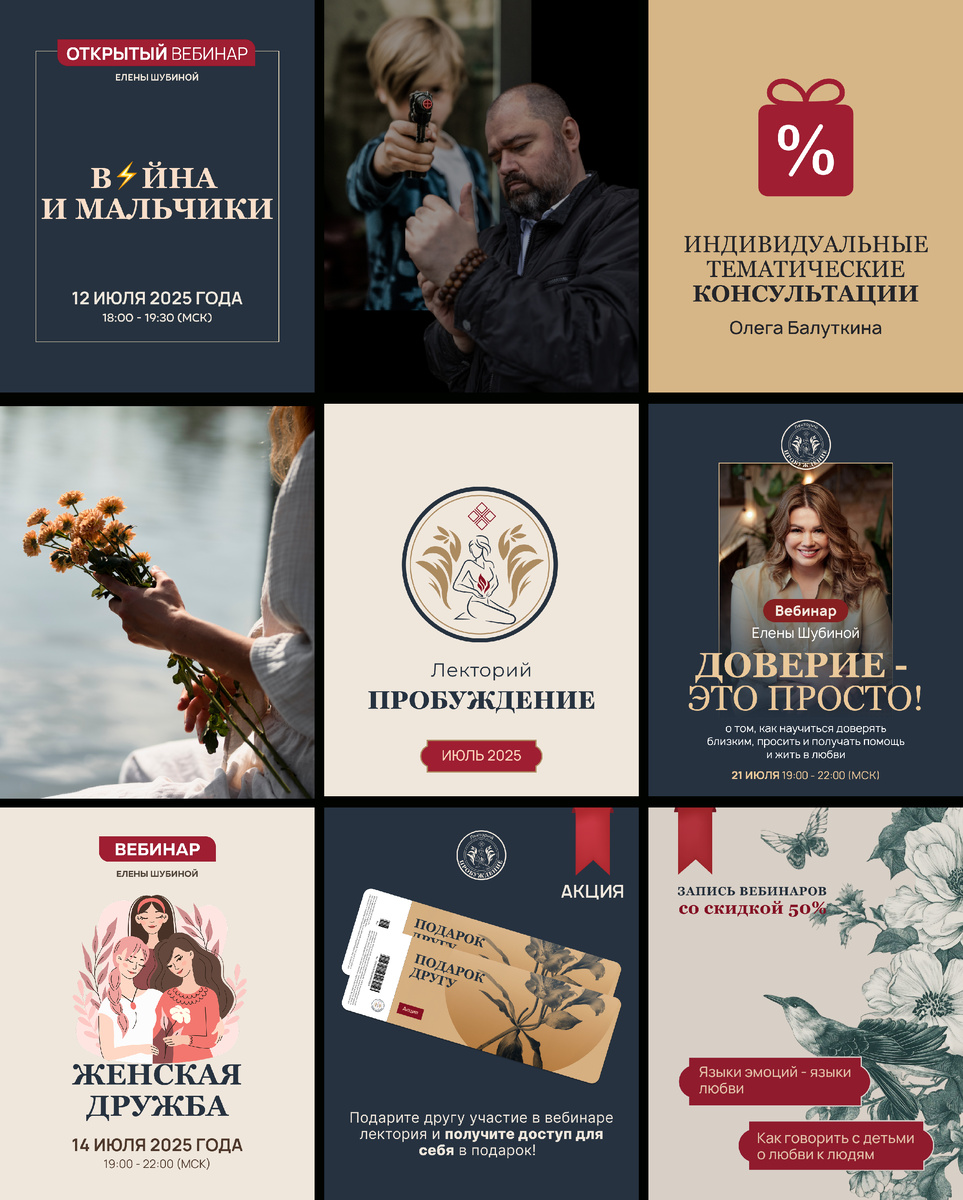 Друзья, представляем вам расписание лектория на ближайшие две недели. 📝12 июля в 18:00 (Мск) мы приглашаем вас на открытый (бесплатный) вебинар Олега Балуткина «ВОЙНА И МАЛЬЧИКИ». Вас ждёт глубокий и доверительный разговор с мужчиной-психологом о том, как помочь современным детям справиться с реалиями наших дней. 📝14 июля в 19:00 (Мск) Елена Шубина приглашает вас на вебинар «Женская дружба». Погрузимся в тонкости и нюансы отношений взрослых подруг, честно обсудим спорные моменты и возможные перекосы такой дружбы. Посмотрим на себя как на подругу со стороны. Получим рекомендации, как быть, если подруга любимая, но отношения стали токсичными. 📝25 июля состоится вебинар Елены Шубиной «Доверие — это просто!» Без доверия невозможны ни одни отношения, но почему же так трудно порой доверять? Вас ждёт погружение во всестороннее исследование темы доверия и ответы на самые наболевшие вопросы. 🔔А ещё, внимание — акция июля. В этом месяце вы можете купить записи двух крутых вебинаров наших пре