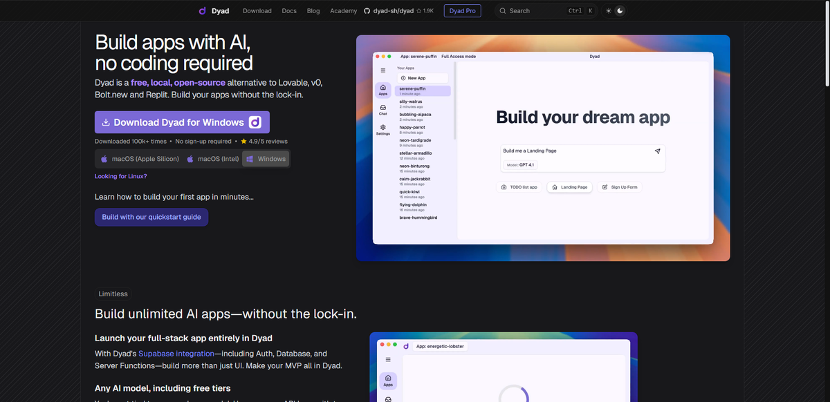 Dyad — это бесплатный и полностью локальный инструмент для создания AI-приложений, не требующий подключения к облаку и регистрации. Работает на Windows, macOS и Linux, поддерживает любые языковые модели (GPT‑4, Claude, Gemini и локальные через Ollama), не передаёт данные во внешние сервисы и даёт полный контроль над процессом разработки. * Локальная работа: весь функционал запускается на вашем устройстве, код и данные не покидают машину. * Поддержка любых моделей: можно использовать OpenAI, Claude, Gemini, Mistral, а также локальные модели через Ollama. * Интеграция с Supabase: встроенная база данных, авторизация, серверные функции — всё в одном месте, без лишних настроек. * Быстрое создание интерфейсов: достаточно ввести запрос, и Dyad сам сгенерирует рабочий UI и связанный backend. * Полный доступ к коду: приложение сохраняется в обычной директории, редактируется в любом редакторе кода (например, VS Code). * Быстрый предпросмотр: все изменения отображаются мгновенно, есть история дей