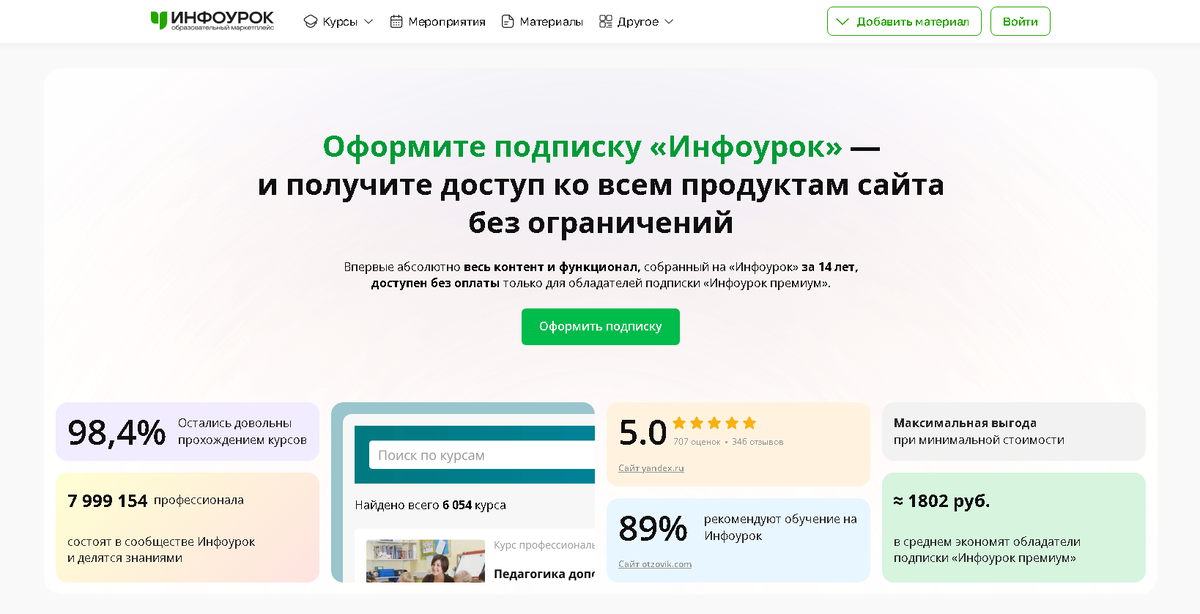 Инфоурок — это популярная образовательная платформа, предоставляющая широкий спектр учебных материалов и курсов для педагогов и учащихся. Платформа предлагает различные услуги по подписке, которые помогают пользователям получить доступ к эксклюзивным материалам и событиям.