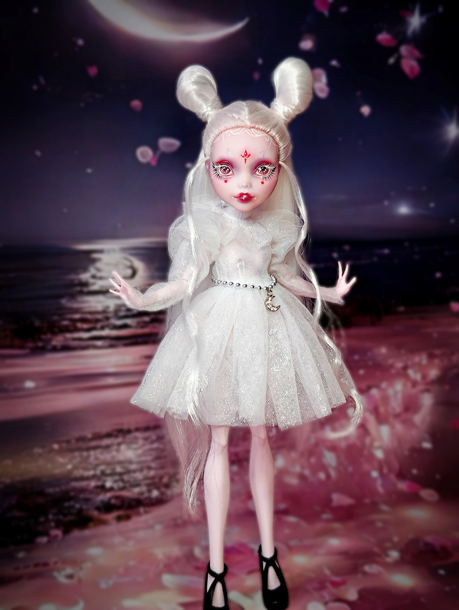 К куклам Monster High я потеплела относительно недавно, в моей коллекции уже несколько монстряшек третьего поколения (G3). Куколки, выпущенные на тщедушных телах 2010-го года меня не привлекали, но знаю, что многие коллекционеры MX любят именно старые выпуски. Как говорится, каждому своё. Однако меня давно интересуют OOAKи на базе Monster High первого поколения, эти куклы словно из другого мира, манят меня своей творческой аурой. И вот, наконец, я приобрела подобную монстряшку у мастера Анастасии (Fumi Dolls). В руках Насти побывали многие мои куклы, однажды я даже брала у неё интервью. Перед вами Лунный кролик — персонаж азиатской мифологии. Кукла продавалась без аутфита, наряд мне посчастливилось найти на Авито. Мне подсказали, что он был куплен в кукольном ателье "Доспехи стрекозы". Все ссылки оставлю в комментариях к публикации. Единственный элемент, добавленный мною в образ дополнительно — пояс с полумесяцем от коллекционной Барби Midnight Moon Princess 2000. Существует неск