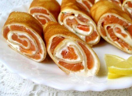 - Подача: Блинчики с лососем можно подавать в виде рулетиков, сложенных стопочкой или просто свернутыми треугольниками. Украсьте блюдо веточкой укропа и долькой лимона.