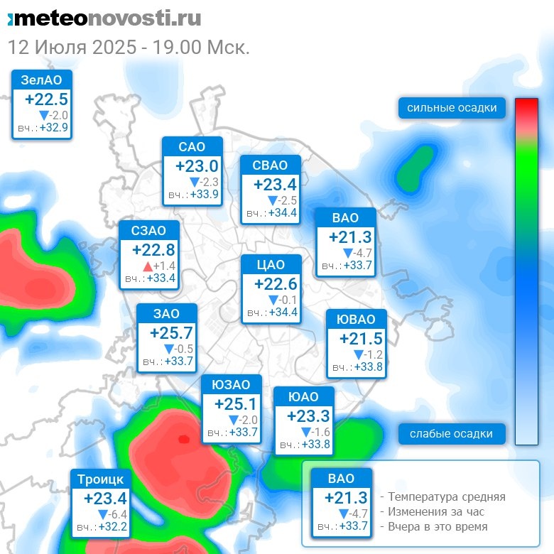 В 19:00 в Москве было от +19.3°C до +26.1°C, средняя температура +23°C #погода #Москва #лето #температура #12июля #суббота