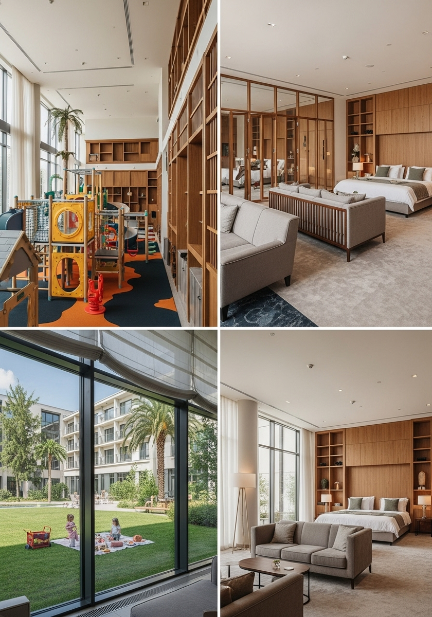 Отель предлагает 238 номеров различных категорий, включая семейные варианты. Детям до 3 лет предоставляются бесплатные детские кроватки, а для детей 8-16 лет доступны дополнительные кровати. В отеле работает ресторан с детским меню, есть кафе-пиццерия. Гости отмечают просторные номера и красивый вид на парк из окон.