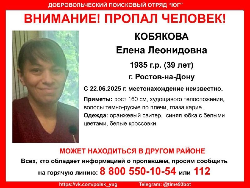 Внимание! Пропал человек! #Кобякова Елена Леонидовна, 1985 г.р. (39 лет) г. #Ростов_на_Дону С 22.06.2025 г. местонахождение неизвестно. Всех, кто обладает информацией о пропавшем, просим сообщить по телефону бесплатной горячей линии 88005501054 или 112. Если вы готовы помогать в поиске пропавших без вести, приглашаем присоединиться к телеграмм-каналу оповещения: t.me/poisk_161