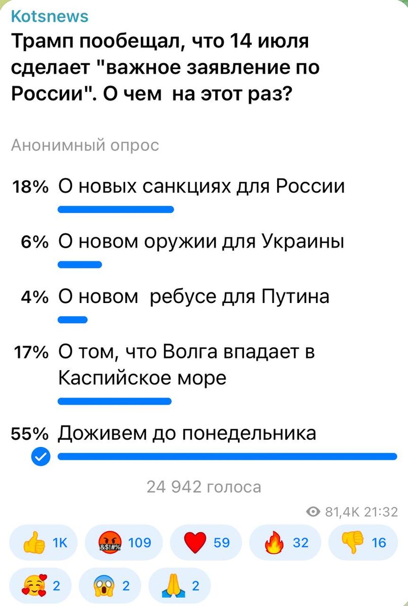 ⚡️⚡️⚡️ 55 процентов подписчиков считают, что к понедельнику Трамп уже забудет, что обещал на этой неделе