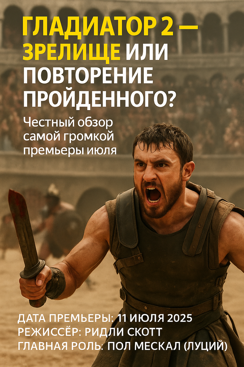 📅 Дата премьеры: 11 июля 2025 🎥 Режиссёр: Ридли Скотт 👨🎤 Главная роль: Пол Мескал (Луций) 25 лет спустя. Именно столько времени прошло с момента выхода культового «Гладиатора», и теперь, в 2025 году, Ридли Скотт возвращается в пыльные арены Рима. Но получилось ли у него повторить успех? 📌 Сюжет без спойлеров Новая история вращается вокруг Луция — юноши, повзрослевшего в тени героизма Максимуса. Луций (Пол Мескал) — человек с внутренним конфликтом, втянутый в жестокую политическую игру. Его путь — не только борьба за свободу, но и за личную правду. 💥 Что впечатляет: Визуал и постановка боёв — арены, кровь, песок и ярость возвращаются с новой силой. Это настоящий кинематографический аттракцион. Музыка Ханса Циммера — всё ещё мурашки. Эпично и уместно. Игра актёров — Пол Мескал доказал, что может быть наследником не только по сюжету, но и по уровню исполнения. ❗Что не сработало: Сценарий местами кажется вторичным — многое как будто мы уже видели в первой части.