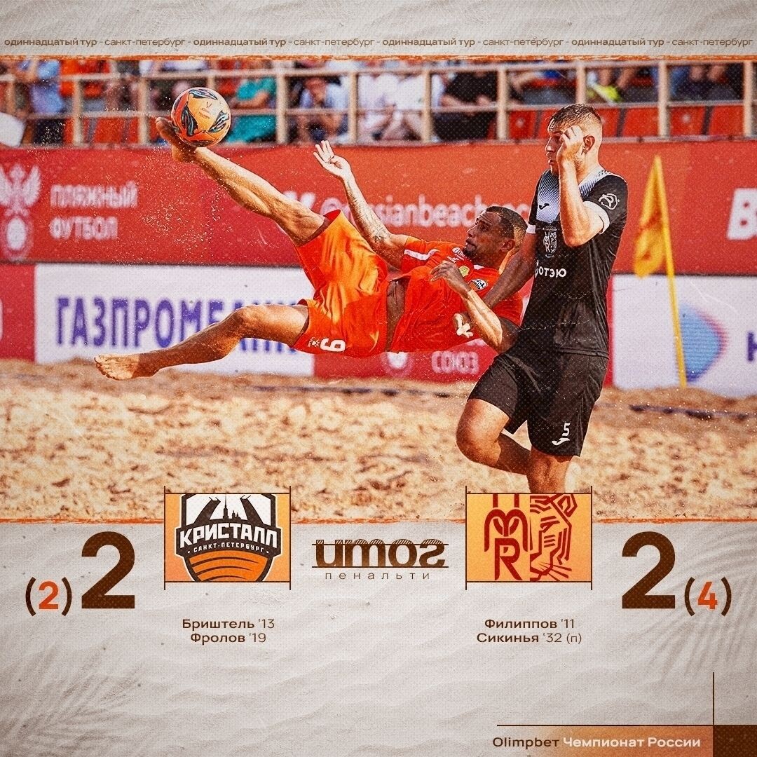 Пляжный футбольный клуб «Кристалл» из Петербурга проиграл сегодня «Краснодару» и оказался на четвертой строчке в турнирной таблице чемпионата России. Матч, который прошёл в Северной столице, закончился в основное время со счётом 2:2. А а в серии пенальти точнее были гости – 2:4. Другой петербургский клуб, «Лекс», дважды не удержал победный счёт и проиграл московскому «Локомотиву» – 5:6. Таким образом, перед последним игровым днём «Кристалл» находится на четвёртой строчке в турнирной таблице, отставая от лидера на пять очков. «Лекс» же опустился на седьмое место. Завтра, в заключительный игровой день, «Кристалл» на стадионе «Нова Арена» сыграет с «Локомотивом» (18:00), а «Лекс» встретится с ЦСКА (16:30). Напомним, ранее в Петербурге прошёл матч за Суперкубок России по пляжному футболу. Трофей взял петербургский «Кристалл», обыграв обладателя кубка страны «Саратов» со счётом 5:4.