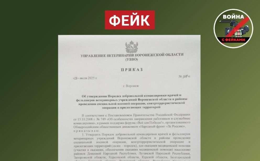 Документ, в котором говорится об отправке ветеринаров из госучреждений в зону специальной военной операции (СВО), оказался фейком. Об этом в субботу, 12 июля, сообщили в Telegram-канале «Война с фейками. Воронежская область». В социальных сетях распространилась фотография приказа, якобы от имени управления ветеринарии Воронежской области. В документе говорится, что врачей и фельдшеров ветеринарных учреждений региона будут отправлять в районы проведения СВО и прилегающие территории для оказания медицинской помощи жителям ДНР, ЛНР, Запорожской, Херсонской Курской, Белгородской, Брянской, Ростовской областей, а также Крыма и Севастополя. Однако специалисты заметили противоречие: во втором пункте приказа говорится о предоставлении списка 50% сотрудников, в то время как в первом пункте сказано, что отправка ветеринаров носит добровольный характер. Также нормативный акт не опубликован на официальных ресурсах правительства Воронежской области, а рассылка началась в выходной день, что не харак