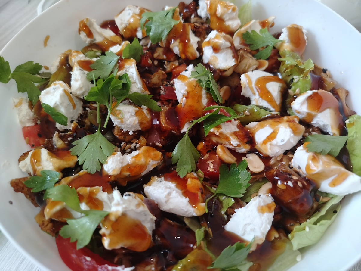 ❤️ Баклажан средний - 1 шт ❤️ Крахмал - 3 ст.л. ❤️ Томаты (или черри) - по вкусу ❤️ Петрушка свежая - по вкусу ❤️ Творожный сыр - по вкусу ❤️ Соус Терияки ❤️ Соль - по вкусу ❤️Арахис ❤️Листья салата 1️⃣Баклажан вымойте, очистите и нарежьте крупными кубиками. 2️⃣Посолите баклажаны и хорошо обваляйте в крахмале. 3️⃣Обжарьте в разогретом масле до золотистой корочки. 4️⃣Выложите на бумажные полотенца для удаления лишнего масла. 5️⃣Смешайте баклажаны с соусом. 6️⃣В салатник выложите листья салата, томаты, петрушку и сыр. 7️⃣Добавьте баклажаны в соусе и аккуратно перемешайте. 8️⃣Посыпьте порубленным арахисом. Приятного аппетита!