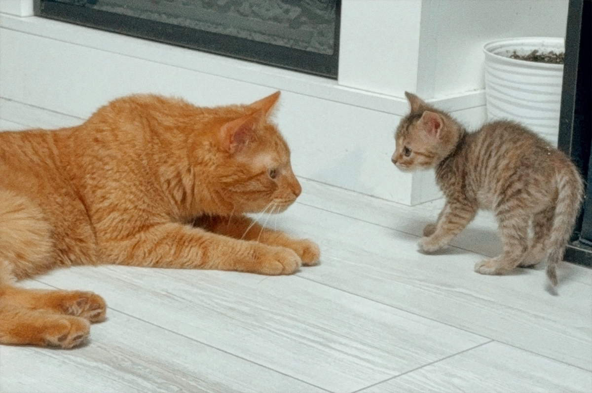 Первой из укрытия вышла темная девочка. Она вообще на порядок смелее своей трехцветной сестры. Ребята понюхались, на Рэя нашипели, но ответа не последовало. Он продолжал тихо и спокойно наблюдать за дерзким ребенком.