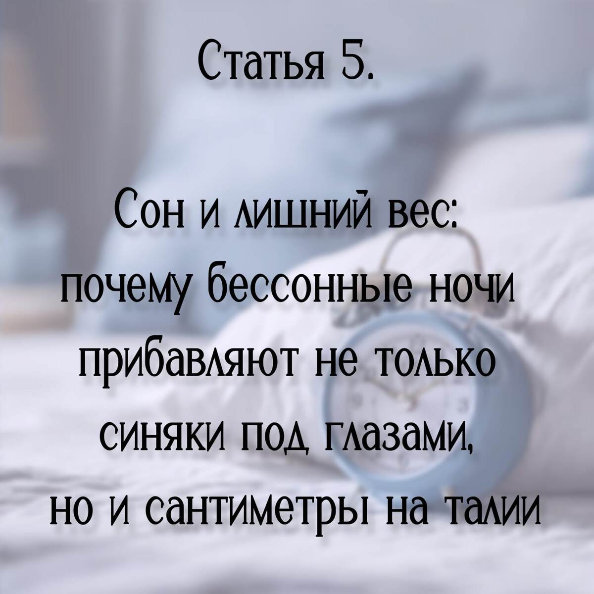 Привет всем, кто знает, что сон — это важно, но почему-то регулярно на это забивает. Сегодня продолжим разбираться, что именно недосып делает с нашим организмом. Уже обсудили, как он разрушает иммунитет и портит внешность. А теперь давайте про килограммы. Да, недосып — это не только синяки и морщины, это ещё и прибавка на весах. 😴 Связь между сном и лишним весом: научные факты Учёные бьют тревогу уже давно. В 2010 году исследование, опубликованное в журнале «Sleep», показало, что люди, которые спят меньше 6 часов в сутки, имеют на 55% больше шансов набрать лишний вес по сравнению с теми, кто спит 7-8 часов. Ссылка на исследование: https://pubmed.ncbi.nlm.nih.gov/20139781/