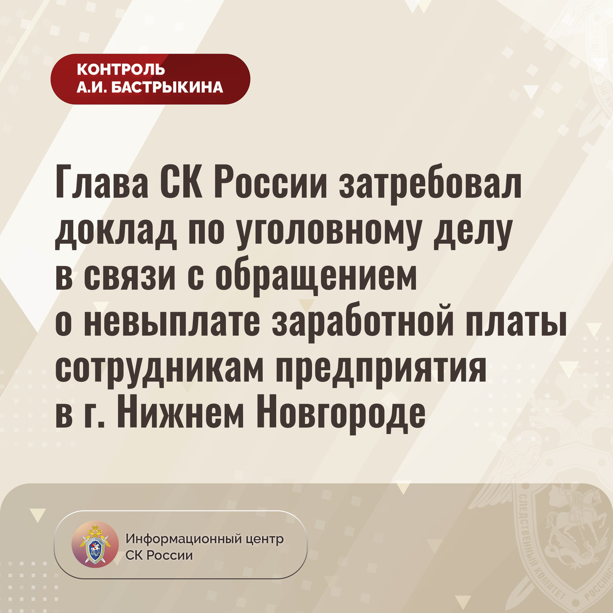 Глава СК России затребовал доклад по уголовному делу в связи с обращением о невыплате заработной платы сотрудникам предприятия