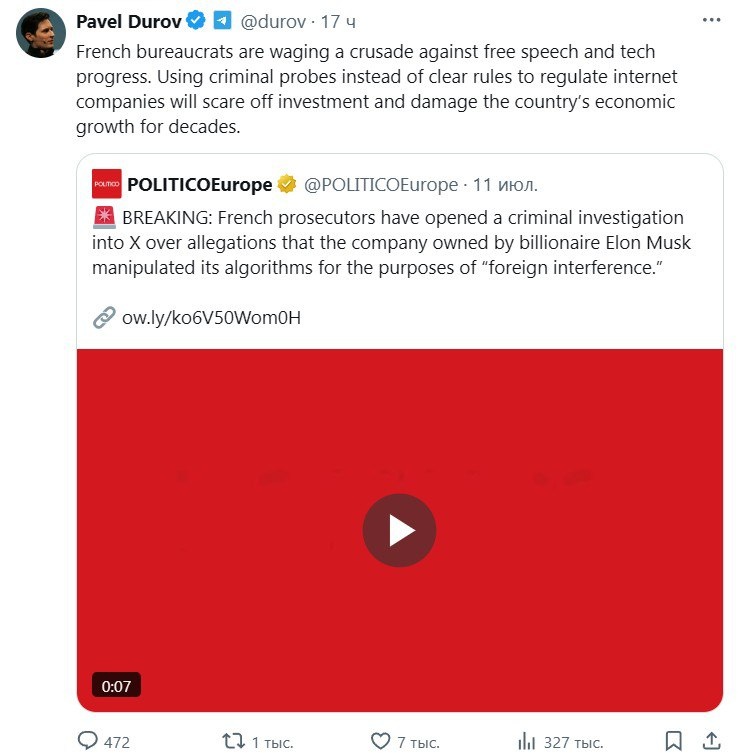 ☄️ ПАВЕЛ ДУРОВ ОБВИНИЛ ВЛАСТИ ФРАНЦИИ В «КРЕСТОВОМ ПОХОДЕ» ПРОТИВ СВОБОДЫ СЛОВА И ТЕХНОЛОГИЙ Павел Дуров, основатель Telegram, выступил с резкой критикой властей Франции. По его словам, вместо установления чётких правил для регулирования интернет-компаний, там используются уголовные расследования. Такой подход, считает он, отпугнёт инвесторов и негативно скажется на экономике страны. Французские бюрократы развязали крестовый поход против свободы слова и технологического прогресса. Использование уголовных расследований вместо чётких правил для регулирования интернет-компаний отпугнёт инвестиции и нанесёт ущерб экономическому росту страны на десятилетия вперёд. Это заявление стало реакцией на расследование против социальной сети X, которую подозревают в манипуляции алгоритмами и возможном иностранном вмешательстве. Подробнее об этом писало издание Politico. Что думаешь по этому поводу? Пиши в комменты! #PavelDurov | ВСЁ ПРО AI | AI NEWS | Дзен | ОК