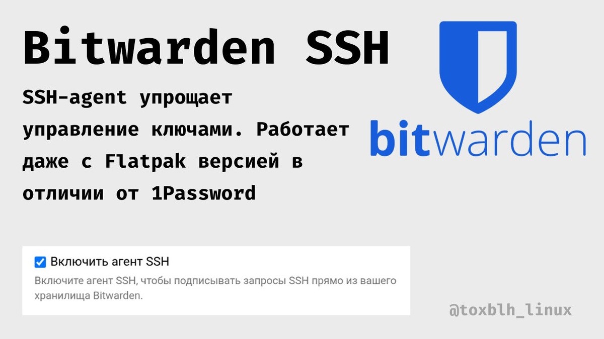 Решил тут месяц назад настроить себе SSH ключи в Bitwarden и что меня удивило в отличии от 1Password - всё отлично работает с Flatpak Инструкция: https://bitwarden.com/help/ssh-agent/ Из необычного, узнал, что можно использовать ssh ключ и для подписи коммитов @toxblh