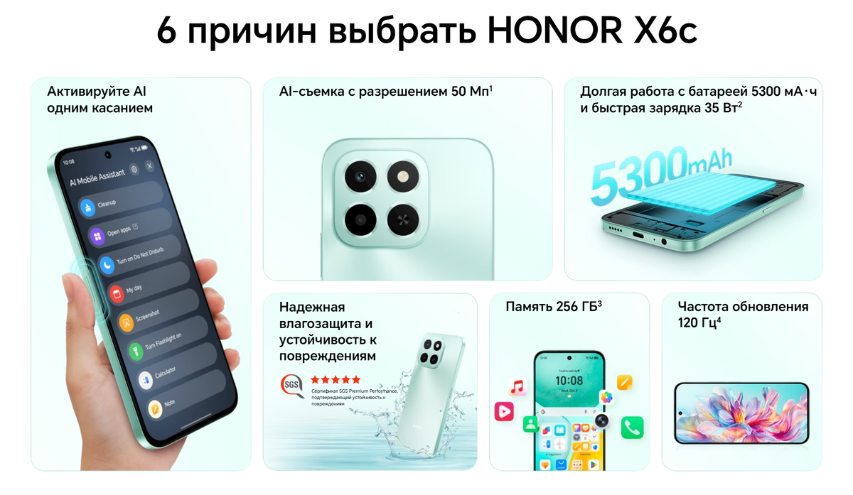В магазинах электроники и на маркетплейсах начались продажи смартфона HONOR X6c. Это бюджетный девайс с батареей повышенной емкости 5300 мА·ч и быстрой зарядкой 35 Вт, тонким и легким корпусом с устойчивостью к повреждениям при падениях и влагозащитой IP64. Новинка привлекает внимание новой кнопкой ИИ-ассистента для быстрого доступа к функциям и приложениям одним нажатием. Есть поддержка ИИ. HONOR X6c обладает повышенной надежностью: усиленная конструкция корпуса и прочное защитное стекло обеспечивают устойчивость к повреждениям при падениях с высоты до 1,5 метра. Влагозащита по стандарту IP64 позволяет использовать смартфон под проливным дождем и снижает риск поломки при случайном кратковременном падении в воду. Вес смартфона составляет всего 199 г, толщина — 8,39 мм. Восьмиядерный процессор MediaTek G81 Ultra обеспечивает производительность для повседневных задач и обладает высокой энергоэффективностью. Кроме того, 6 ГБ оперативной памяти могут быть расширены еще на 6 ГБ виртуальной
