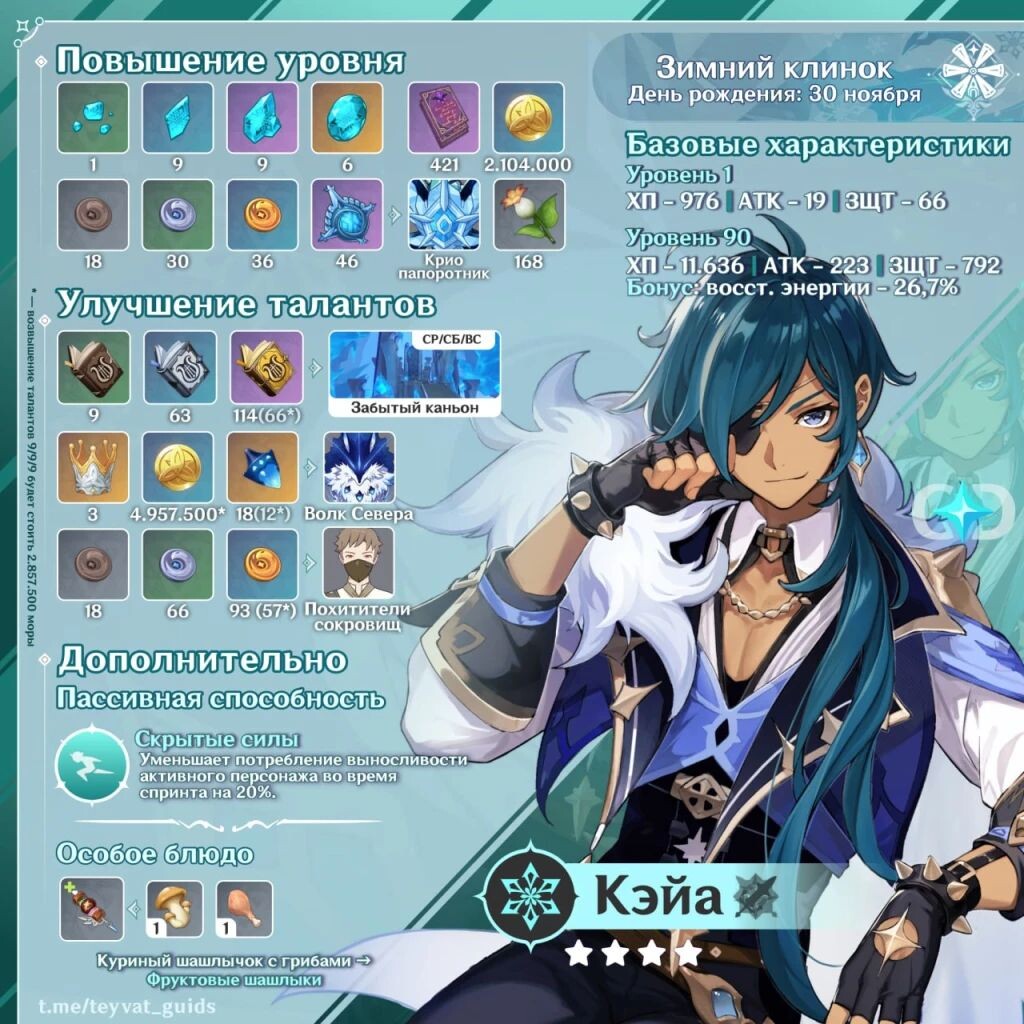 ㅤОн является одним из первых персонажей, которых путешественник получает бесплатно в начале игры. Благодаря низкой стоимости взрыва стихии и стабильному наложению Крио статуса, Кэйю можно эффективно задействовать и в отрядах на более высоких рангах в качестве саб ДД.