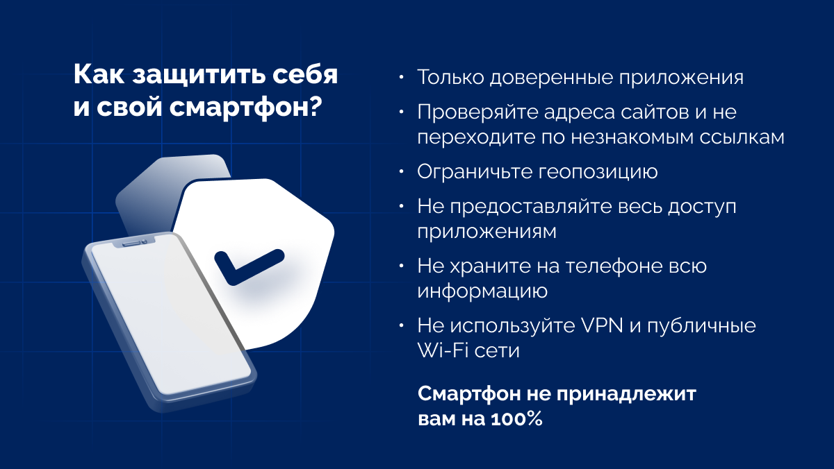 Несколько советов: ✔️Устанавливайте только доверенные приложения. Если есть подозрения — отказывайтесь, удаляйте. ✔️Проверяйте адреса сайтов, чтобы не оказаться на сайте-двойнике и не переходите по ссылкам от незнакомых людей. ✔️Ограничивайте права доступа даже легитимным приложениям, оставляйте только то, без чего они не могут работать. ✔️Когда вы не строите маршрут, выключайте геоданные. ✔️Не доверяйте малознакомым людям, когда они проявляют интерес к вашему смартфону, предлагают поставить приложение или провести какие-то манипуляции. Это могут быть мошенники. ✔️Постарайтесь не использовать бесплатные VPN и публичные Wi-Fi сети — через них мошенники могут воровать данные и даже установить вредонос. ✔️Не храните на телефоне особенно чувствительную информацию, включая фото и видео. Если ваш телефон взломают, то всё это моментально окажется в открытом доступе. Источник: https://t.me/+0vJQezfn2DhjMTcy