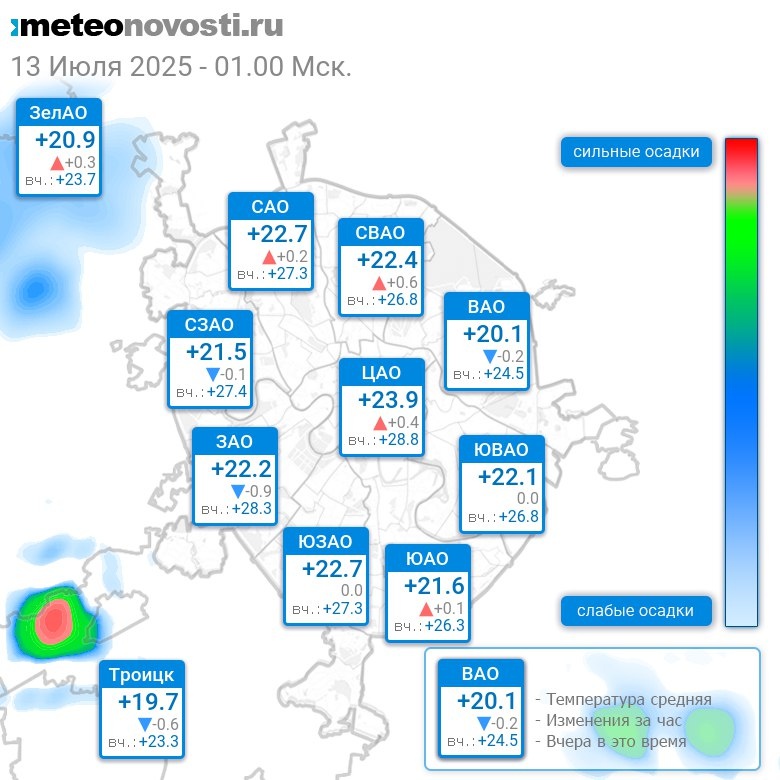 В 1:00 в Москве было от +18.9°C до +24.4°C, средняя температура +21.9°C #погода #Москва #лето #температура #13июля #воскресенье