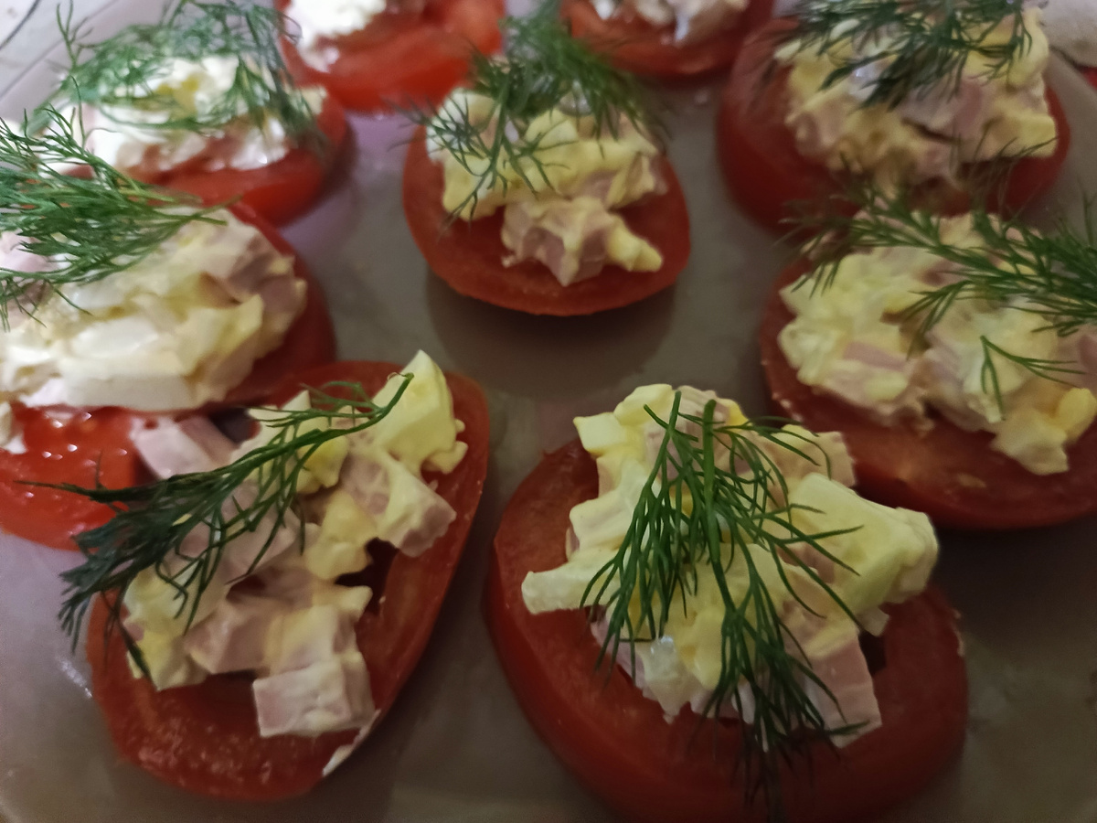 Помидоры нарезаем кружочками и выкладываем на тарелку. В отдельной миске смешиваем нарезанные мелким кубиком вареное яйцо, колбасу, репчатый лук и майонез. Начинку выкладываем на помидоры. Украшаем зеленью.